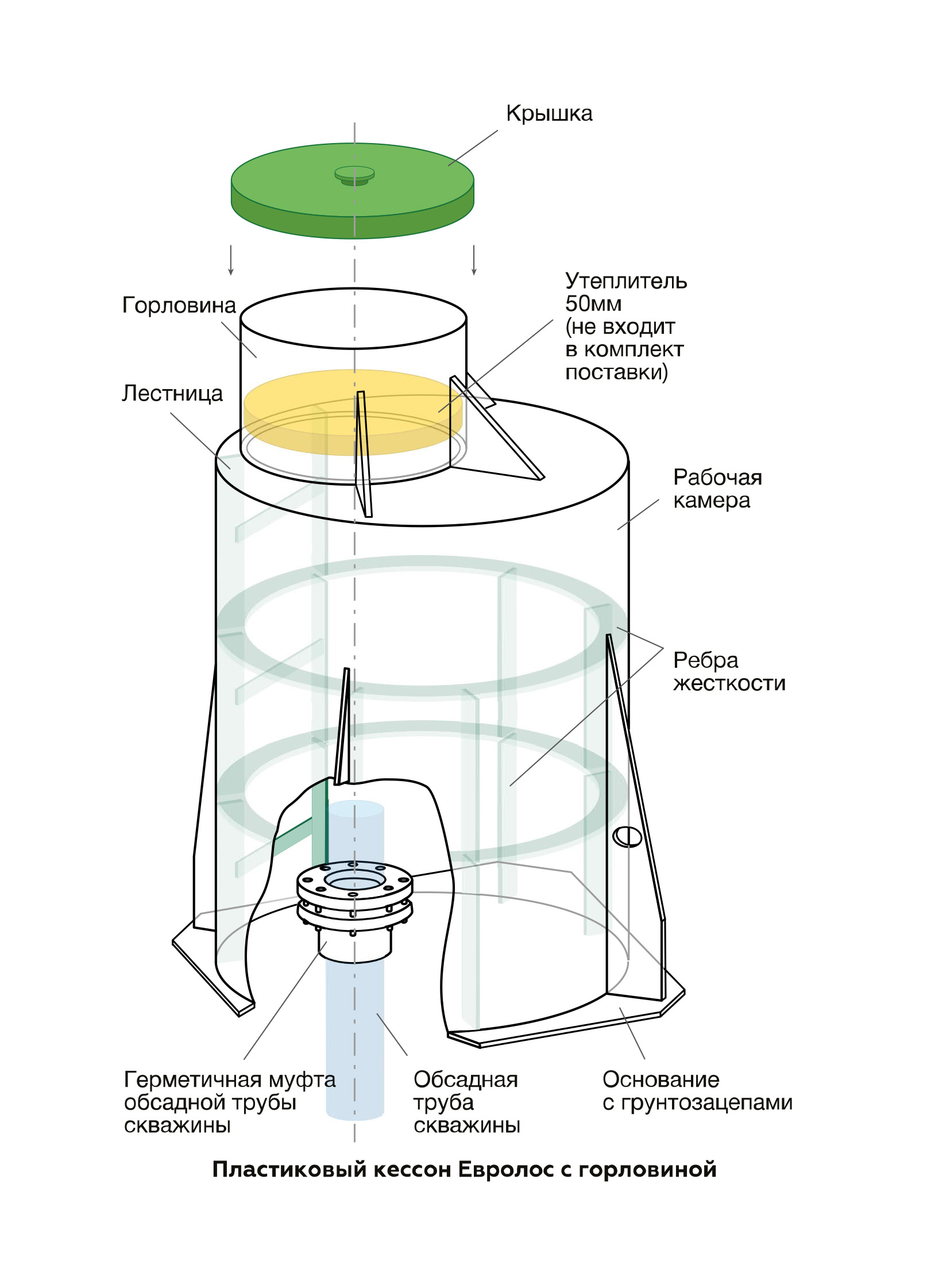 Если кессон поставляется вместе с герметичной муфтой Евролос для обсадной трубы скважины, то её необходимо предварительно разобрать. Для этого необходимо раскрутить все болтовые соединения, снять верхний фланец и уплотнительное кольцо. Обсадная труба скважины обрезается так, чтобы она выступала из бетонного основания не более чем на 500 мм. Пластиковый кессон необходимо поднести и сориентировать относительно приемной трубы в основании кессона. При опускании кессона обсадная труба скважины должна войти в приемную трубу герметичной муфты.